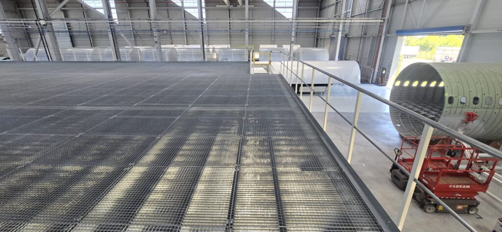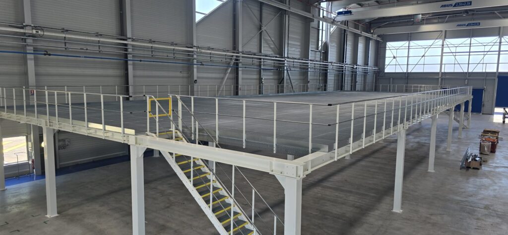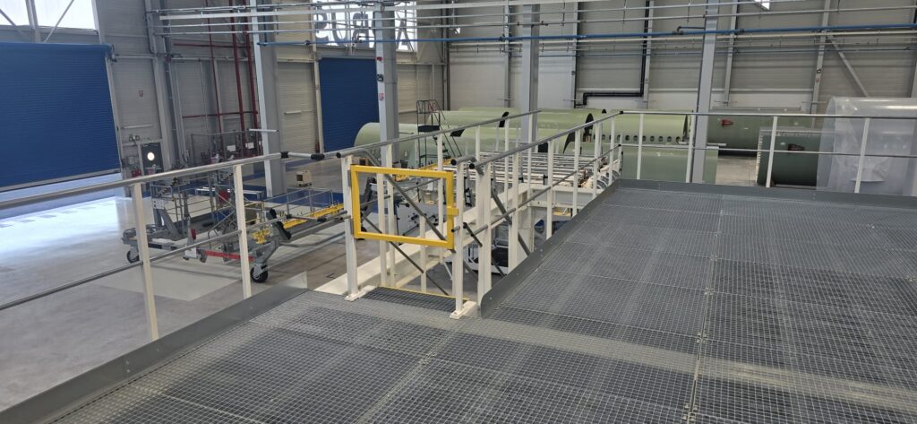 Antresola ma wysokość +6 770 mm i została ustabilizowana za pomocą portali dla maksymalnej wytrzymałości. Dzięki połączeniu profili stalowych walcowanych na gorąco i na zimno uzyskano solidną konstrukcję spełniającą rygorystyczne wymagania branży lotniczej. Otwarta podłoga z krat stalowych zapewnia bezpieczne i dostępne miejsce pracy z optymalną wentylacją i przepuszczalnością światła.