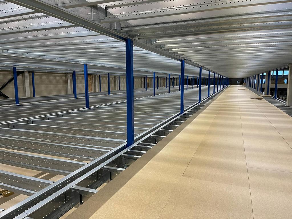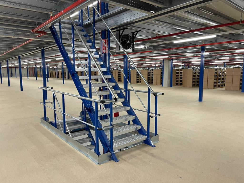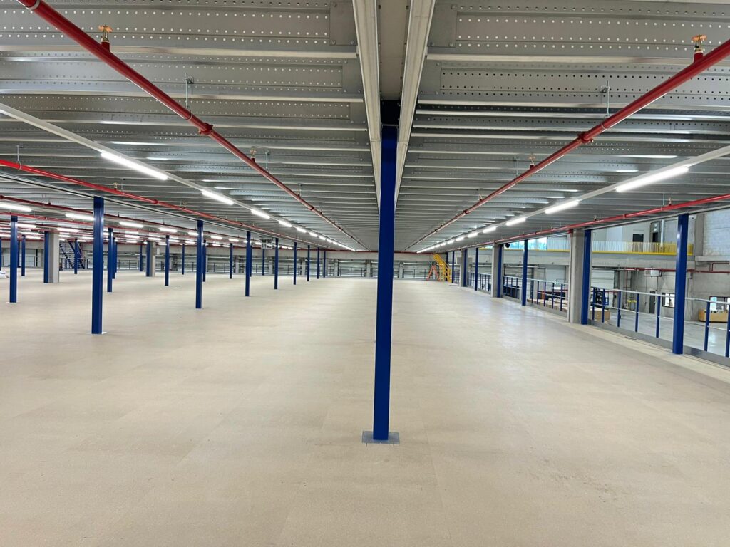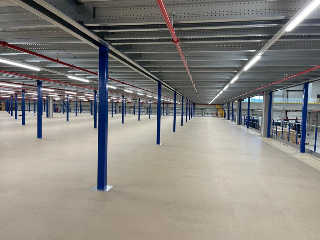 Antresola została zbudowana na trzech poziomach: +3 000 mm, +6 100 mm i +9 000 mm. Dla stabilności zastosowano konstrukcję portalową, zapewniającą maksymalną nośność przy minimalnym ograniczeniu przestrzeni poniżej. Podłoga została zaprojektowana specjalnie do przechowywania i kompletowania odzieży, z naciskiem na otwartą przestrzeń i logiczny układ. Nolte Mezzanine poprowadziło cały projekt – od koncepcji po odbiór – z naciskiem na planowanie, elastyczność i ścisłą współpracę.