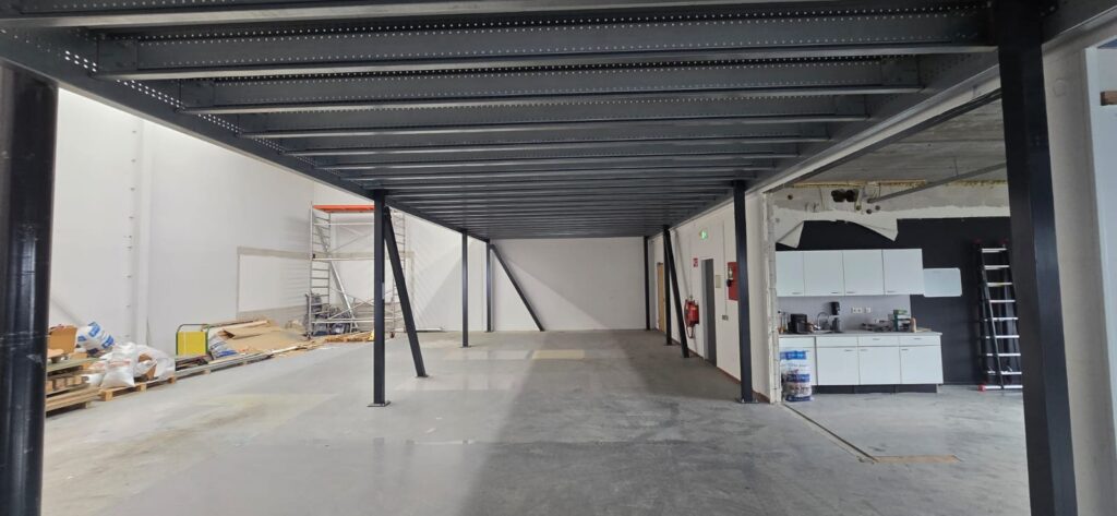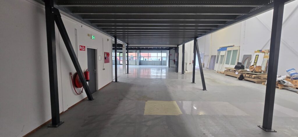 Jednopoziomowa antresola o powierzchni 250 m², która tworzy dodatkową przestrzeń magazynową i umożliwia wydzielenie części biurowej w istniejącym obiekcie